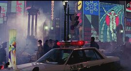 要让故事继续发展,英雄必须得到帮助。这时,帮手的确出现了。一直负责监视他们的日本警官松本(高仓健饰)挺身而出,将佩枪私自还给尼克,尼克在查案时遇到的芝加哥小姐也为他作了日本黑帮扫盲,尼克开始摸着了门道,开始对斋藤实施抓捕,确实也差点将他抓住了,问题是,他抓人的时候让松本通知了日本警方,日本警方赶来的时候,斋藤的摩托和警车檫身而过,日本警察没有将斋藤拦下,反而将尼克按倒。这个场记颇有象征意味,这段戏发生在一个工厂,追逐戏就发生在工厂外面的公路上,尼克背对观众奔跑追凶,迎面赶来的是几辆日本警车还有一大批骑着自行车的表情茫然的日本工人——到底是什么在阻碍尼克?这个场景给我们一个形象的回答——是日本的集体主义精神。日本工人在这里象征的是像工蚁一样的没有思想的群体,他们在西方英雄的眼里,只是一种障碍物。