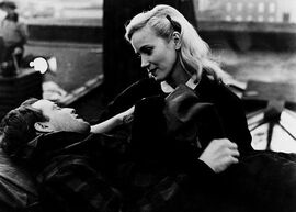 对于伊迪,特里是有赎罪意识的,但这种赎罪意识转化为爱情的老套剧情在如今看来实在是缺乏说服力。但卡赞和白兰度,他们有化腐朽为神奇的力量。在男女主人公初次有互动的场景中,我们看到了码头工人被黑帮工会玩弄于鼓掌之间,他们甚至丧失了做人最起码的尊严。这时,伊迪作为一个弱女子,选择挺身而出,让特里看到了自己所不具备的一种勇气。在非常关键的两场戏:教堂外、酒吧里,则让特里完成了从赎罪到爱情再到自我救赎的转变。如果说在教堂外特里的搭讪还只是普通男女之间的互相吸引,那么酒吧里的谈话则让我们明白,这是两位都饱受良心所困,却做出相反选择的人。在影片中的某一处,伊迪苍白的面孔与头发被置于银幕右上角的某处,而特里则在下方的中间,就好像一个守护天使正在他的头顶盘旋。伊迪与特里的爱情在影片中被描绘为某种道德互补的结果。但在观众看来,却更像是白兰度一次性魅力的展示。在教堂外的那场戏中,特里对伊迪的纠缠是这种性魅力的直接表现,伊迪对特里的“一见钟情”也很大程度上源于这种性吸引力。虽然《码头风云》对这点的挖掘远不及卡赞之后与白兰度合作的《欲望号街车》,但在后面特里用暴力砸烂伊迪家房门时,我们恍惚间会发现《欲望号街车》中白兰度与费雯丽的影子。