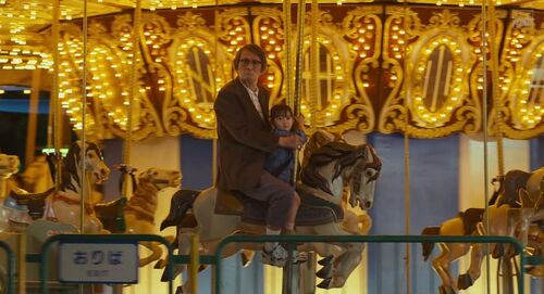 电影里的父亲又一次离家出走了。他乘电车来到游乐场,一言不发地站在旋转木马旁,准备接记忆里幼年的女儿们回家。那一年他四十岁,撑起伞像栎树将雨幕温柔遮挡,他想到往昔很多事,孤单地笑了。在此,电影终于交代他试图寻找的“家”的谜底,而我也终于明白,同样的一个雨天,为什么外公掏出口袋里的纸片,念到上面陌生的名字和地址,颤抖着哭了。当意识的闸门逐渐失灵,人难免会手足无措,但在历史站台彻底坍塌前,他会毫不犹豫地走向前去,颠簸返回蒙尘的雨夜。他一生挂念的全部,就寄付在撑起雨伞的轻轻一瞬。在那场永劫回归的暴雨里,他一再投入着本真的存在。
