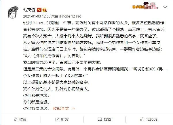 原因是今年一月初,女作者「七英俊」在微博上指责她在参与某次笔会时,被某几个男作者开了下流的玩笑话,以下是七英俊的原文,注意最后几段话,是后续男作者发言的关键点,「你们」这个因为指代问题,被认为是攻击整个男性作者群体。