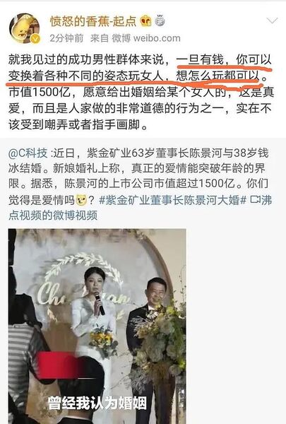 有网友翻出愤怒的香蕉之前的一些对男女两性关系的言论,比如他说:「男性一旦有钱,你可以变换着不同的姿态玩女人,想怎么玩都可以。」