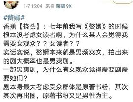 而愤怒的香蕉也非常自信的表示不怕得罪女性群体,因为他在七年前写《赘婿》的时候根本就没有考虑女读者,《赘婿》是男频爽文,拍出来的剧也大概率是男爽剧,所以为什么有女观众会觉得剧需要她们?