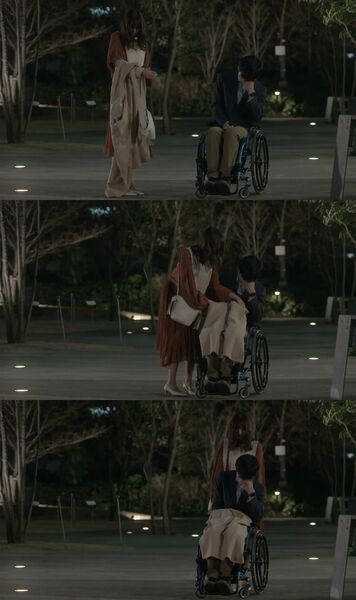 也许是见到前女友后情绪波动,意志一时松懈了,鮎川在川奈面前尿失禁了。毫无体面可言,令人措手不及,残疾就是这样如腐蚀一般,侵蚀着人的尊严。鮎川除了大声说“不要过来,我不想让你再看看到我如此难堪的一面了”之外,连立刻跑回家都做不到,只能无力地坐在轮椅上。