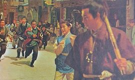 接下去自然是学艺复仇的老套路。但导演只表现了主人公拜师的执着,却完全省略了具体的学艺过程。这当然可以说是出于某种节奏平衡的考量(因后半部武戏密集),但个人胡乱推测,多少也与武侠功夫电影主导权的争夺有关。一个未经全面考证的规律:但凡是演员主导的电影,就特别爱表现学艺过程,而且往往是不惜篇幅的去表现,譬如《醉拳》《少林搭棚大师》《败家子》。而凡由导演主控的,就不喜在此套路环节上多做文章。因为学艺过程必然多是演员的独角戏,对决和阵仗鲜有的登场亮相机会,于是与之相关的那些更能彰显导演主导地位的复杂场调和镜头剪接也就失去了用武之地。