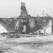 树上挂着一个飞行员,伊娃本能地要去救他,却被忽然出现的士兵怀疑是他们开枪射杀了他。强光照着伊娃的脸,摄影机对着他,那人让伊娃自我介绍,让她说欢迎解放者。他们开始逃难,所到之处全是废墟,大火,草地上卧着软绵绵的孩子的尸体,象一个被人扔掉的布娃娃,他们无处可逃,只能再回来,伊娃对杨说,幸亏我们没有孩子。