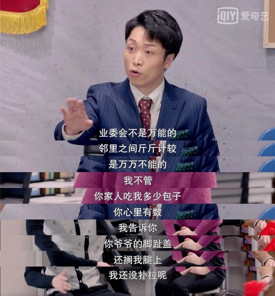 第五集中,在家庭中为于食物链最底端的范程远在小区业委会中找到了存在感,成为幸福家园业委会第一任委员长,每天处理着小区里各种鸡飞狗跳的事情,杭州修脚小杨和杭州小笼包的小王因为一个车位问题找上家里来,想让范程远委员长帮忙解决将主意打到了他的家人身上,一个送包子,一个给修脚,短短十几分钟既展现了范程远翻身当官的状态对比,又反讽官场行贿受贿的现象。一个小小的社区,家长里短邻里矛盾里折射了社会中的不良现象,以喜剧形式反讽现实,可谓是一绝!