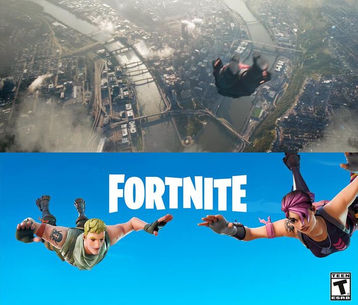 在电影的开场,查宁饰演的游戏角色登场时,从天而降进入自由城之中。对于熟悉《堡垒之夜》和《绝地求生》等大逃杀游戏的玩家来说,这种出场方式可以说是相当眼熟。