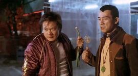 其二。《功夫》中周星驰少年时代的骗局重现。 在这部电影里这个桥段被用了两次。 第一次是葛民辉被徒弟出卖之后痴痴傻傻地走到一个小孩子面前说了那一大堆的话,比如什么小小年纪就有横练的筋骨,是麻雀中的不世奇材,假以时日,维护世界和平保护人类的任务……当然,现在的小孩子已经没有少年周星驰那么单纯了,所以,葛民辉逃不过一段暴打。 而第二次是葛民辉的徒弟的最终结局。这个桥段的运用以及重复的手法其目的其实和第一个桥段的运用是同一个作用的。只是这里面又加了一层因果报应的寓意。所谓种善因得善果。其实这两段看起来颇为搞笑。原来,现在的香港人依旧祈盼有这样的困果循环的寄托。 而另一个搞笑的地方是同样的小孩子的反应看起来已经现实了许多了,而赋予这样一个桥段如此重大的意义又显得天真无比了。