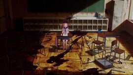 由纪和同学交谈→美纪发现由纪→由纪没有露脸,背对着美纪,美纪一脸担忧,背对这个动作,暗示着距离感→突然由纪对着的窗变成破碎的,而且黄昏变成了血色→镜头往远处拉,由纪在破败的教室里,四处是血迹和碎片,背景颜色仍是一片血红→由纪仍然在和同学说话→镜头一转,由纪说话的是之前同学的项圈,项圈已经烂了。