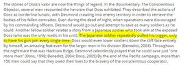 戴斯蒙·多斯由安德鲁·加菲尔德饰演。他是一名忠诚的基督徒、军医,性格内敛且体质较弱,拒绝在战场上使用武器。尽管如此,在冲绳战斗中,他仍然冒着生命危险将75名伤员从战场上拖回救治,并因此被授予美国国会荣誉勋章,这是美国最高的军事荣誉之一。