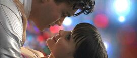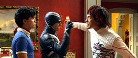 《Speed Racer》一定是沃氏兄弟的完美梦想,两人拍这部片的时候,大原则一定是“100%的原著漫画感”。看完片子后,我觉得他俩120%地完成了任务。片中角色不动,背景变换的方式能让传统影片观众丈二和尚摸不清头脑,但看美日漫画长大的朋友一眼就知道,热血漫画都是这种套路,男主角大头不变,说了句热血台词,背景就变成了爆炸效果;男主角回忆某人,背景绝对变成被回忆者的照片集。另一处漫画风格具体体现的地方是Speed一家海扁坏人的场景,每人的动作后面都有表现动感的速度线,小时候看过《七龙珠》的朋友不会陌生吧!