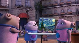 达成了来巴黎的主要战略目标的两位主角在即将离开时遭到一大波Boov人的包围。这帮严阵以待的Boov人拿出了威力极强的可穿戴设备——我去年买了个表,给两位主角带来异乎寻常的压迫感。Boov人的领袖Smek舰长隆重登场,并以一个长者的身份来对喜欢弄个大新闻的小Oh循循善诱。身经百战的Smek舰长宇宙中的星球哪一个他没有去过,连凶狠的Gorg人也与他谈笑风生。可惜冥顽不灵的两个年轻人还是选择了强行突围,在激烈的追逐战之余,两人还从一个吃货手里成功抢救到一幅舌尖上的梵高。我虽然读书少,但也能一眼看出来这幅《星空》肯定是赝品,因为真品的画面里明明有只骚气蓬勃的跳舞树人。