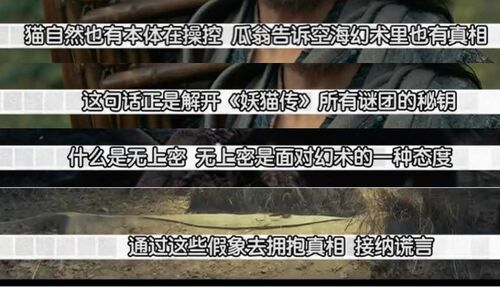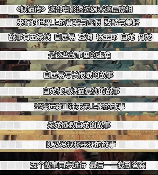 这个故事并不简单,它真正想要表达的东西就隐藏在片子中,等待有心人的发现。大家一定记得,白居易和空海刚组队时,曾经看过一场幻术表演:瓜翁用幻术变出西瓜,白居易以为是真的,空海知道是假的,瓜翁知道空海没有中术,送他西瓜,途中,西瓜变成鱼头,白居易准备扔掉时,鱼头却又变成半块烂瓜。这个情节到底想说什么呢?先按下不表。接着,白居易和空海就去查陈云樵家的妖猫案了。在陈家的故事中,妖猫一共附了三个人的身:丽香、陈云樵、春琴、。我们来看看三次附身都干了什么。附身丽香:送蛊毒酒给陈云樵喝,且看到玉莲喝了也不阻止。附身陈云樵:勒死春琴。附身春琴:说出“我的命和她一样”“别埋我,地下冷”等话。最后,陈家的故事结果是春琴死,陈云樵疯。之后,空海十分疑惑地找到瓜翁。瓜翁说了一句话:“幻术中也有真相。”空海听了这句话茅塞顿开。“幻术中也有真相。”这句话正是解开《妖猫传》所有谜团的钥匙。正如瓜翁所说,电影中出现的所有幻术中都有真相。请让我一一道来。一、什么是幻术?(一)瓜翁的幻术回到开头瓜翁变瓜的故事:瓜翁用幻术变出西瓜,白居易以为是真的,空海知道是假的,瓜翁知道空海没有中术,送他西瓜,途中,西瓜变成鱼头,白居易准备扔掉时,鱼头却又变成半块烂瓜。电影中说了,瓜翁并不能凭空变出瓜来,是本来有一只瓜。在变瓜的幻术里,一只瓜是真相,其他的瓜是假的。鱼头象征假象。半快烂瓜则是真实的。(这是瓜翁最初一只瓜的部分,因为别的围观人士买的也是最初那一只瓜的部分)白居易把幻术当成真相,错了。空海对了吗?他看到鱼头并不惊讶,说明他知道这是假的。但他看到烂瓜却很惊讶,说“我也中了幻术”。空海虽然比白居易的认识高一层级,但他把幻术看成全部是假的,也错了。怎么认识幻术才是对的呢?“幻术中也有真相。”即幻术中有真有假。(二)妖猫的幻术片中另一个使用幻术的人是妖猫。它在陈家的故事中使用幻术附了三个人的身,这三次的幻术使用中,同样是“幻术中也有真相”。附身丽香:送蛊毒酒给陈云樵喝,且看到玉莲喝了也不阻止。真相:丽香因为陈云樵移情别恋,恨陈的移情,嫉玉莲的夺爱。附身陈云樵:勒死春琴。真相:陈云樵认为是春琴带来祸事,希望摆脱春琴从而摆脱祸事。附身春琴:说出“我的命和她一样”“别埋我,地下冷”等话。真相:春琴委屈绝望的心情。三次幻术,行为都是假的,由妖猫控制的(就像陈云樵说的“不是我杀的”),但情绪都是真的。(二)黄鹤的幻术即尸解大法:能闭气保存容颜不老是真,能存活是假。(三)李隆基的幻术大家应该还记得,阿部在日记里曾说:“玄宗是最大的幻术师。”玄宗什么时候成了幻术师了呢?他的幻术就是爱情。与白龙对杨玉环的真爱相比,玄宗的爱情确实是有真有假的幻术。他对杨玉环的爱有真实的部分,但也充满了谎言,因为这会让位于懦弱与残忍。由此可见,这部电影构造了一个充满幻术的世界,即真相与谎言交织的世界。因此,《妖猫传》的核心主旨并不是大唐风流的展现、更不是讲述一个无聊的人人都爱杨贵妃的玛丽苏故事。上面我们已经分析出,所谓幻术就是真相与谎言的交织。其实,《妖猫传》真正想要探讨是真相与谎言的问题,以及如何对待真相与谎言交织的世界。下面,我们来看看片子是如何探讨的。二、什么是“无上密”?先说结论:无上密说的是面对幻术的态度。我们看看电影中的人物是如何对待幻术的。(一)杨玉环我想先说杨玉环。杨玉环在片中遇到了三个幻术:1、李白《清平调》是为她而作;2、玄宗对她的爱3、阿部的爱(不敢说出,没有真正救她)这三个幻术都是有真相有谎言。但杨玉环知道其中的谎言部分以后,并没有崩溃愤恨:李白自己戳穿了谎言,杨玉环却由衷赞赏“大唐有你才是真的了不起”;阿部的爱止于眼神,但杨玉环说“我很满足”;玄宗的爱经不起危难的考验,杨玉环固然失望,却还是把表达爱意的香囊送给玄宗。可见,杨玉环面对幻术的态度是:正视并接纳幻术中的谎言,珍惜和回应幻术中的真相。总结一下就是:接纳谎言、拥抱真相。这八个字就是空海孜孜以求的无上密。杨玉环是《妖猫传》中最早参透“无上密”的人物。(二)白居易和空海如果说,杨玉环面对幻术的境界是最高的,已参透“无上密”。那么电影开头的白居易和空海,正好是第一层和第二层。白居易:天真,认为自己看到的就是真相。比如幻术师变出来的西瓜。比如史书上对李隆基杨玉环爱情的记载。当知道那里有谎言之后他无法接受,说:“你不能说我的长恨歌是假的”。这与杨玉环面对谎言的平静态度全然不同,境界的差别非常明显。这也可以说是“看山是山”的境界。空海:理性,有怀疑精神。比如能看出瓜是幻术变出来的。比如认为史书记载可能是假的。但是在瓜翁提示他之前,他却不知道“幻术中也有真相”。这是“看山不是山”的境界。而杨玉环的境界,即“无上密”的境界是“看山还是山”。到了片尾,空海说“通过杨玉环的生死参透了无上密”,白居易说“一字不改,诗是假的,可情是真的”。白居易也参透了无上密。也就是说两个人都明白了一个道理:这个世界是由真相与谎言交织成的,我们要认识到这一点,不要否认现实。同时,如何对待这样的世界呢?接纳谎言,用力地拥抱真相。也可以延伸为:明白这个世