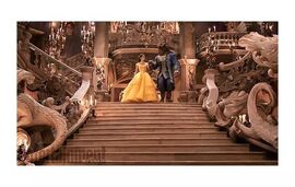 无论在动画版还是真人版,这件晚礼服都是电影焦点所在。真人版用丝质的透明硬纱面料缝制而成,点缀着金色碎叶和闪亮细节,和城堡舞厅的融入一体。