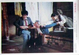 巩汉林饰演的广东老板(倒爷)出现了,操着一口蹩脚的普通话,(母鸡的啦)看样子与村主任关系不一般。