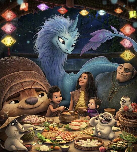 从一碗冬阴功汤开始,《寻龙传说》展开了它在动画架空世界中,让文化入味的尝试。这可能是这么多迪士尼长篇动画中对吃最为执着的一部动画,也正如东南亚民族对美食的热情。东南亚人爱吃,有些国家的香蕉不仅是水果,还可以被作为一种计量单位;以前马来西亚的纸币上都印着香蕉;在越南的当地谚语里,就有“为学语先学吃”这一说。和中国一样,越南人打招呼也喜欢说“吃了吗?”。《寻龙传说》片中出现频率最高的一句台词,除了凸显本篇核心主题的“信任彼此”,就是一句“有谁饿了?”这句话代替了“你好吗?”“交个朋友”等一切打破僵局的潜台词,推动人物关系的发展,表面上看上去是打算去吃饭,实际上意有所指,这种行为在亚洲文化里被统称为“饭局”。从这个角度来看,电影片头神龙宝石的守护者为了统一龙佑之邦,竟然寄希望于请大家吃顿饭,就不难理解了——如果有一顿饭不能解决的事情,那就来两顿。