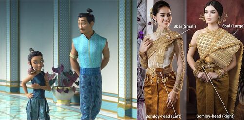 拉雅作为迪士尼动画系列中的第十三位公主,她的宫廷服饰看上去非常像老挝、柬埔寨和泰国那边的民族服装Sbai。