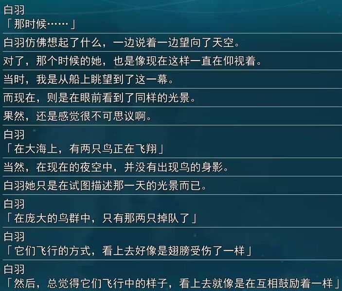 在道别之后羽依里的笑容缓慢消失,他回过头去,看向天空,心声:“这里是孤独的候鸟聚集的小岛,忘却了飞翔的鸟儿聚集的乐园”。