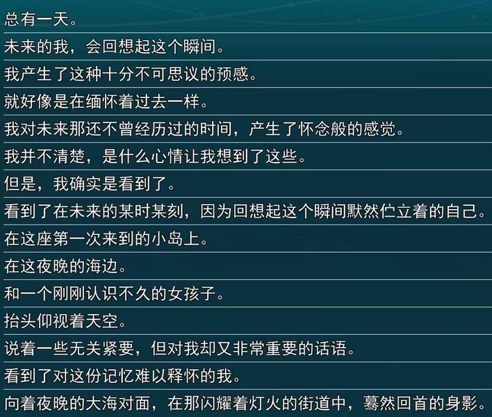 原本是一个静下心来的安静的段落,喧嚣结束之后羽依里开始了对于自己为何来这个岛屿,为何会想要来这里的思考,进而引出了后来与白羽在海边对话的内容。