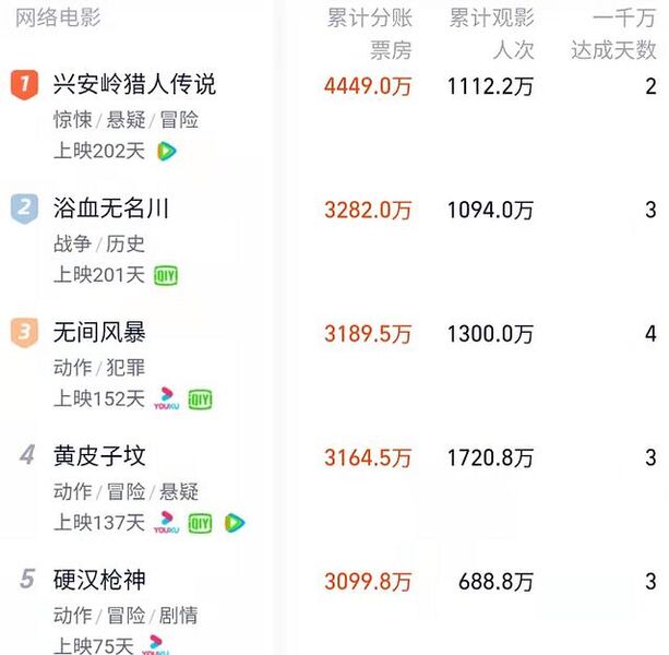 院线电影红红火火,网络电影也没有落后。今年至今已经在各视频平台上映了数百部影片,其中有51部突破千万票房,《兴安岭猎人传说》更是以4449万的成绩高居榜首。