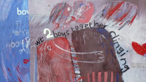 最开始我们想为影片取名We Two Boys Together Clinging,来自大卫·霍克尼的画(被译为“我们两个男孩胶在一起”),这幅画灵感来自沃尔特·惠特曼的一首诗,表现两个男人之间的兄弟情谊。Clingin是一个特别有表现力的词,表示想要紧紧地与某人相依在一起。