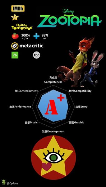 在《疯狂动物城》中,动画的设计者们不能再直白地点出了“各族人民大团结”的中心思想,用主人公从偏见的受害者到无意识的加害者的变化,意图在观众的心里埋下一颗真诚相对的种子。《疯狂动物城》巧妙而敏锐地结合了温柔和智慧,非常及时地在当下传播和呼唤更多的包容和平等。在我看来,这部电影真正闪光的地方就是在当下的社会环境中,能够大方地涉及到种族和宗教信仰的歧视,提出了一些很有趣的问题,无论是儿童还是成人观众都会在故事结束之后有所思索。考虑最近种族之间的紧张关系,尤其是美国以及欧洲的难民危机,这显然是一次非常有趣和大胆的观影体验。 虽然大量的台词对于不成熟的观众来说会有些稍嫌唠叨,但电影传递的信息非常明显:偏见和固有印象是极度危险的。面对这个伟光正到无法指摘的主题,《疯狂动物城》的主题曲应该是迈克尔·杰克逊的《Heal the World》。因此,仅仅从主题上看,《疯狂动物城》就已经超越了一般动画的讨论范围,而完全应该当做主流的、有诉求的轻喜剧犯罪电影去认真对待。 迪士尼在本片中献出了最巧妙的建筑设计和动物形象,用一只兔子和一只狐狸来代表人类的梦想,野心,才能和缺陷,创造了完美的隐喻。在两个产生了优秀的化学反应的角色身边,在一座精心雕琢的疯狂动物城里(有着无数的惊人细节等待观众发现),上演了一出犯罪惊悚风格大戏。城市环境的设计参考了诸多流行和现代文化要素,试图为这个严肃的主题提供一个温和同时而又丰富多彩的舞台。 伴随着兔朱迪和狐尼克的鬼马双警之旅,观众不仅接触到他们的世界,也对我们周围的世界产生着反思。两位主人公的角色在电影中得到了很好的开发,有着合乎逻辑的表现和变化。当然,作为一部动画电影,大量的幽默空间是必不可少的。有很多非常有趣的双关语和画面表现影射了对各种动物的刻板印象,并且丝毫不显俗气。总的来说,这可能是自迪士尼走上伟大复兴之路以来,最让人惊喜的迪斯尼动画电影。《疯狂动物城》有着优秀和可爱的角色,一个华丽的故事舞台,一些不错的笑料,而最重要的是:对孩子和成人都传达了一个强而有力的积极信息:和平造就伟大。