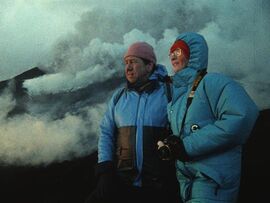 但是,这也意味着他们总是生活在“人类节律”与“地球节律”的冲突与张力之中,因此而不断对生命的意义进行质疑与思考。如何看待他们短暂的生命与穷尽一生也无法见证其中万一的火山活动的关系?如何衡量随时有可能在研究活动中降临的、如影随形的死亡,和死亡导致的阴阳永隔?当深爱的火山吞噬无数无辜生命时,该如何自处?从影片中我们可以看到,在这种矛盾中不断进行的磨砺与思考让他们从追寻新奇体验的冒险者变成了老练的科学家和甘愿为人类福祉一生挚爱牺牲自我的——如果我可以这么说的话——英雄。面对火山的永恒与危险和人类生命的脆弱与短暂,他们的回应是“比起漫长而无聊的一生,我宁愿选择短暂而充满精彩的一生”,要用生命见证“人类的雄心与虚荣”(“How great is the ambition and vanity of men”);考虑到在冒险中失去另一半的可能性,他们的回应是要永远走在一起,就算要离开人世,也绝不放弃彼此;而在见证好友死于危险的灰火山喷发,数万民众被灰烬埋葬的惨剧之后,他们更是毅然选择放弃探索美丽红火山的安全生活,自愿接近危险得多的灰火山(用Marice的话说,对于行家而言,探索红火山只用冒一定的“calculated risk”,而灰火山的危险性则连最老练的火山学家都无法预测)以获得足以警示世人的一手资料,并最终为此殒命。在影片的最开始,导演就坦诚地展示了他们的结局,但又用此后的全部篇幅向所有观众说明,他们对此早有预测,这是他们自己做出的选择与牺牲。
