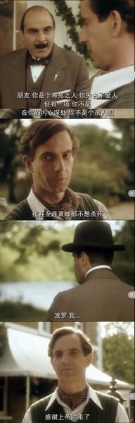 EP04 【蜂窝谜案】一对好友哈里森和克劳德爱着同一个女人莫莉,莫在一年前和克订婚,然后分手和哈在一起,在一场花园派对上又旧情复燃,哈请克周五早上去他家除蜂。周五上午,克用汽油除蜂失败,约定周三晚上再来试一次。周五中午,波罗应邀来到挚友家吃午饭,发现水缸里都是汽油,波罗猜想是哈故意把克的汽油罐子里的汽油倒入水缸,使得克第一次灭蜂失败,而第二次,克一定会去买更厉害的氰化钾来灭蜂,而氰化钾可以杀人。波罗知道挚友病重只剩两个月的生命并且已发现莫莉背叛了他,他预料到了挚友的计划是要在克第二次带着氯化钾来灭蜂时偷拿一点倒在茶杯里自杀,然后嫁祸给克。一切已经发生了,但什么都还没发生,这是波罗职业生涯最艰难的时候,解决一件不存在的犯罪,拯救挚友。他偷溜进克家,把氰化钾换成了洗涤剂,并在周三克和莫离开后来到挚友家陪着他。最后,挚友释怀了。这个故事真的很温暖,波罗拯救了挚友的灵魂,让他善良的心灵得以在人生要落幕时不被仇恨的黑暗吞噬。当他对挚友劝说道,“朋友,你是个将死之人,你失去了爱人,但有一项你不是,在你的内心深处,你不是一个杀人犯。”,挚友回应,“我甚至连黄蜂都不想杀死”,他终于坦然放下了。临别前挚友的那句“波罗,感谢上帝你来了”一定是发自内心的感叹。