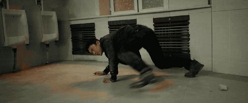 《武馆》秦鹏飞:对,第一个摔是一抓胳膊,苗哥身体一拧,利用身体的力量把他给压倒的;第二个摔,其实是一个大的摔,苗哥一抱腿连人一起趴在地上,而且峰超他摔的时候把另外一个格子间里的洗手池又给砸烂了,最后落地,这个是导致他最终被制服的原因。但事实上,那个洗手池不是道具,是真的洗手池,被我们给砸坏了,本来想避开这个位置,结果就给打在那个上面。本来我还有几招是要再把马桶给砸了的,但是我一看,这个动作已经把洗手池砸了,跟后边的效果差不多,于是后边的动作我就没要。