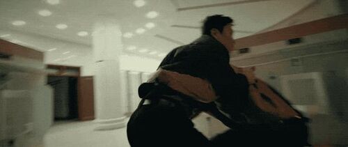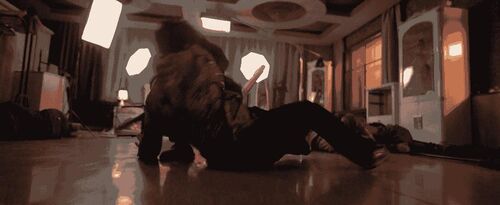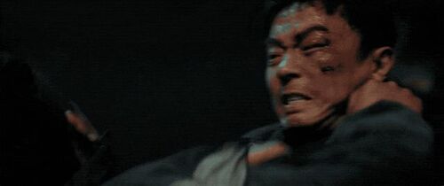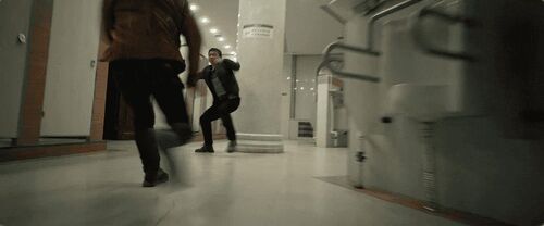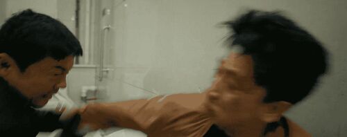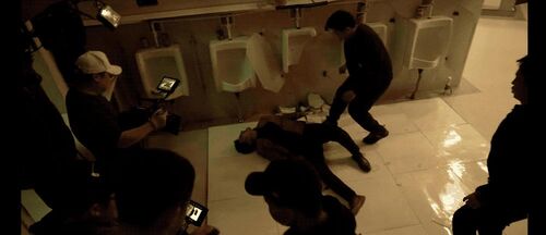 第一导演:这里还有一个节奏,峰超把谢苗站压制在墙边,花盆都撞碎了,感觉峰超的力量更大些。秦鹏飞:对,这也是故意设计的,因为他俩在冲进厕所格子间之前,十八对李红旗蛮是有威胁的,李红旗解脱完这个压制之后,一脚把十八踹到格子间门口,这时候李红旗意识到,要冲上去主动把十八撞进格子间。第一导演:换成狭窄环境,我就有优势了。秦鹏飞:是这个意思。这时候发生几个变化,一是提升了狭窄空间,二是膝和肘的攻击把伤害性给提高了,三就是与此同时摄影难度加大了,机器不好放,完全没有空间,所以说只能就慢慢让摄影师适应,摄影师拍摄前也都要全副武装,护具全部戴好。不过我自己这场戏是有点私心,我是想致敬刘家良老师很早的一个片子叫《武馆》。第一导演:最后那个巷战?秦鹏飞:对,就那个ending打戏,我特别喜欢!第一导演:那场戏全片最牛逼,想象力爆裂。秦鹏飞:前辈还是前辈。所以进到格子间之后,超哥跟苗哥他俩打的是有一点点古装范儿的。第一导演:没错!俩人突然在那站立套起招来了!不过最终还是靠摔技解决战斗。