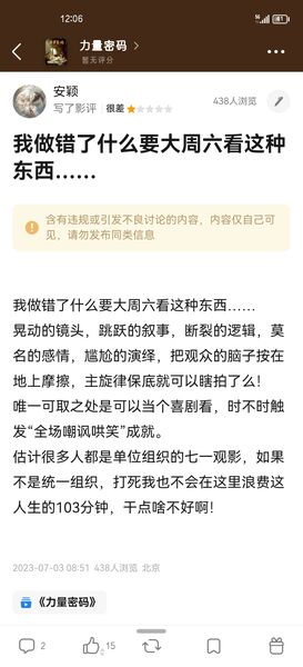 上周六去看的电影,回来以后按真实观影体验写的评价,结果头一次在豆瓣遇到屏蔽,百思不得其解,我寻思着我也没写啥不该写的啊,难道连差评不能写了吗?