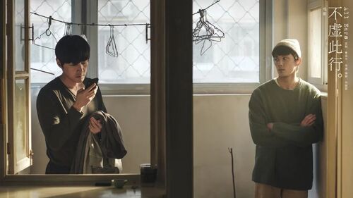 当然,如果故事单单只有人物的讲述,只可能导致一部依赖于表演和剧本的、充满说教意味的电影;真正赋予《不虚此行》中的一个个故事以生命力的,是导演的讲述,换言之,是导演如何组织人物和事件,如何构想和编排每一个情境,如何进行场面调度——正是这些方面体现出刘伽茵作为一个电影作者的姿态,而这种姿态从未动摇。毫无疑问,相较于《牛皮》系列在极限之中肆意炫技的影像,《不虚此行》采用了远为通俗的电影语言进行它的讲述;但是,那些沉静而拒绝操控性的固定镜头,以及每每在场景运转的中途(例如,人物刚刚抛出了一个问题,或做出了一个动作)便将其掐断的剪辑,让我们知道刘伽茵仍与18年前一样,在讲述的语法和讲述的语义之间保持着审慎的距离。在闻善第一次拜访王先生家的一镜到底的固定镜头中,二人交谈片刻,妻子回来了,拉开镜头右侧的窗帘,露出几盆稀稀拉拉的绿植,它们是逝者所留下的最后遗物;这难道不正是《牛皮》第二个镜头所奠定的理念吗?镜头始终没有动,但场景却借助精妙的设计将自身层层剥开,露出其最核心的东西——一沓红色的广告纸,或一块白板的背面。