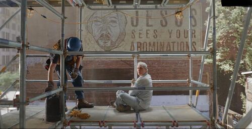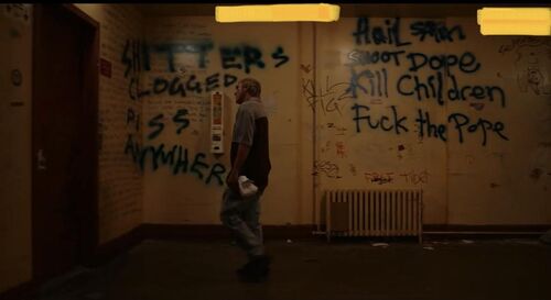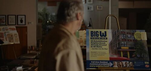 Beau的公寓门上贴了一个安全告示。警告居民有一种含有剧毒的棕色隐士蜘蛛在公寓楼出没。告示上丘吉尔的 “伟大的代价就是责任” 显然与蜘蛛无关,但增加了电影整体氛围的压抑的内疚感和失败感。
