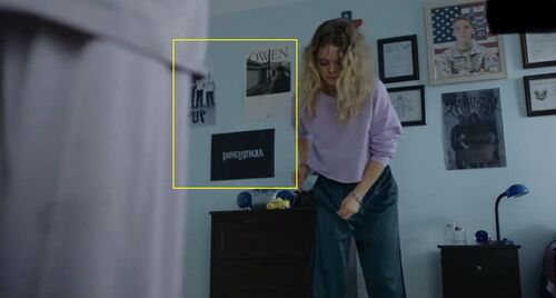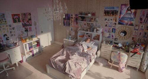 卧室的墙上贴着虚构的K-pop组合:Only1、BF2000、Gottawakka 和 Ki55,slogan是“we are 55 boys and we love you.” (我们是55个男孩,我们爱你)。还有虚构的电影海报:“Professor Marvelous: Final Exam”(神奇教授:期末考试)和 “Confessions of a Teenage Llama Queen”(少年羊驼女王的自白)。