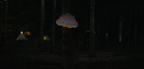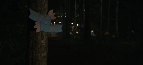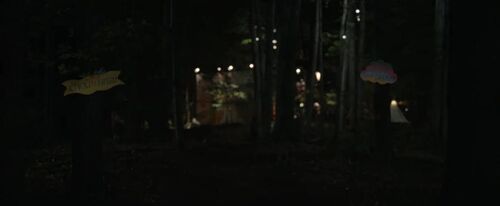 当Beau开始走进森林的林地定居点时,他经过了一系列钉在树上的木牌,木牌上都写着“Nothing to excess”,“know thyself”,“Follow every rainbow till you find our dream”。这些语句全部来自百老汇音乐剧的歌词。