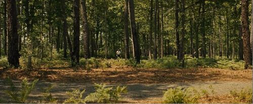 沙马兰在这一问题的处理上可谓单刀直入。代表传统类型结构重要部分的一家人开车到访被放置在影片中段的回忆部分。电影开始的节点也即是对类型元素调用的起点。小女孩抬起头,看向景深近乎平面的森林,完美代表类型片刻板人物形象的巴蒂斯塔出现,一出大戏拉开了帷幕。