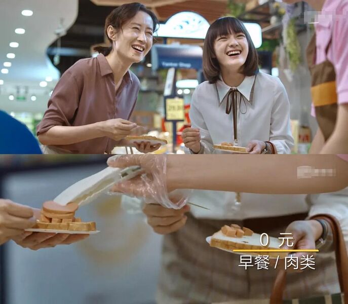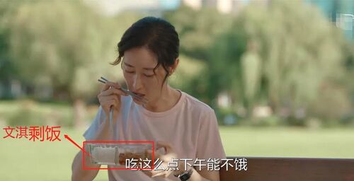 上一秒文淇还在超市靠试吃充饥,下一秒就看到她吃剩一堆饭和肉,整盒饭仿佛没动过。