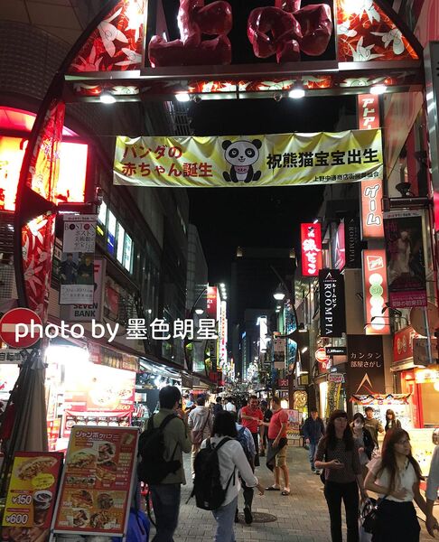 特别有意思的是,2017年的10月,我和闺蜜去东京和镰仓旅游,抵达东京的第一晚,我住在上野附近,晚上去逛街的时候看到商店街的人们挂着横幅庆祝香香出生。
