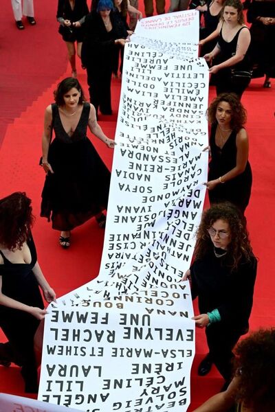 法国数名女性在戛纳红毯上为死于家暴的129位女性抗议