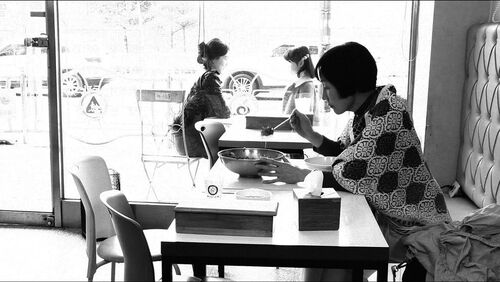 如果说《小说家的电影》内在洋溢着一股压抑不住的自我爱怜情绪的话,在第一层潜文本中它似乎是金敏喜本人的自我审视和欣赏;但在第二层潜文本下,前者只是一个爱恋的对象,真正起主导地位并沉迷其中无法自拔的,是银幕外摄影机后那股操纵者自身无以复加的迷恋情结。要说洪常秀影片中复合多层又耐人寻味之处,正是在于他将这样价值莫辨的异动情绪,通过冷峻又刻意的庸常层层包裹起来,用充满潜台词的手法组合成了一部貌似波澜不惊的对话电影。