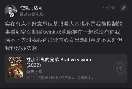 因此,《寸步不离的兄弟》受到大家喜爱,绝非是一些“骨科擦边球”“军中禁恋”的猎奇口味在作祟。佐洛图金选择了一个小且具体的主题,美而精准地表达了出来,而附着于之上的议题探讨或者政治诉求反而显得不是特别重要了。 本次入选奇遇单元,更像是柏林对于这位“名师高徒”的小习作给予的又一个肯定。这位十分年轻的导演已经朝着“柏林嫡系作者”又迈进了一步,或许不久的将来,我们就能在主竞赛中再次与他相见。