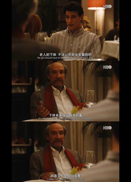 80岁的爷爷,明着浪。但无奈身体不行了,只能打打嘴炮。一到酒店就和酒店服务员调情,餐厅吃饭大开黄腔,和歌女搂抱后,说自己感受到性唤起。