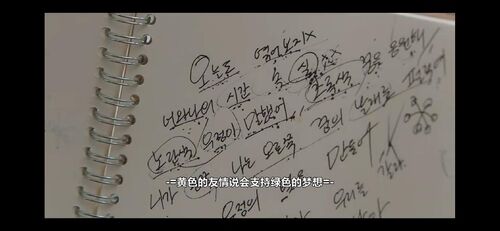 镜头一转是恩秀翻到了以前自己的歌词本,看到了自己写到“黄色的友情说会支持绿色的梦想”,回忆到学生时代自己支持宣宇送给他一部相机,