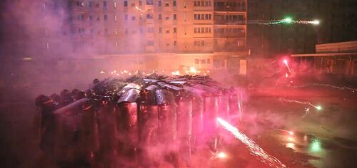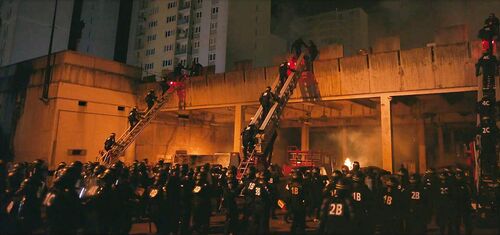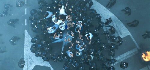 为数不多的直接表现警察报复式暴力执法的批判性镜头。警察明知这批撤离家属并非暴动分子,仍实施了恃强凌弱的合围催泪喷雾。为之后的警察遭围攻做铺垫和对比。