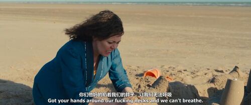 此间不难看到女性被男性所控制的顺从、怨憎与自戕,以及由此生发的对爱的极端敏感与逃避心态。在一场本该是浪漫的海滩戏里,对男性无意的指手画脚突然歇斯底里的希拉里,毁掉了象征稳定与美好的沙堡,印证了身份创伤的严重。