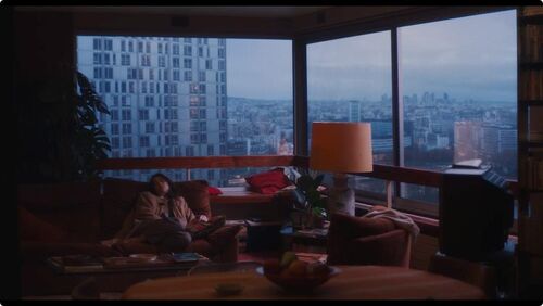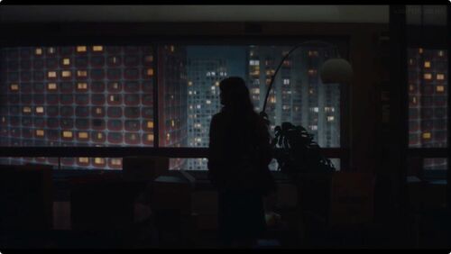 难眠的夜晚,伊丽莎白时常站在窗前抽烟、收听深夜电台,她的窗外有一座令人瞩目的红色大楼,建筑外墙上是密密麻麻的窗户,这个场景让人想起《了不起的盖茨比》中,尼克从窗中往外望去,说道: