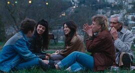 迷影情节是属于法国电影的浪漫,三个孩子去电影院,墙上张贴着《德州巴黎》的海报,是德国新电影运动四杰之一的导演,维姆文德斯的代表作。三人因错过尼古拉斯·凯奇主演的《鸟人》而偷偷溜进去看侯麦的《圆月映花都》。这部上映于1984年的电影,片名的含义是月满之夜,也是一个讲述巴黎的故事。导演将其中的一段插入影片当中。