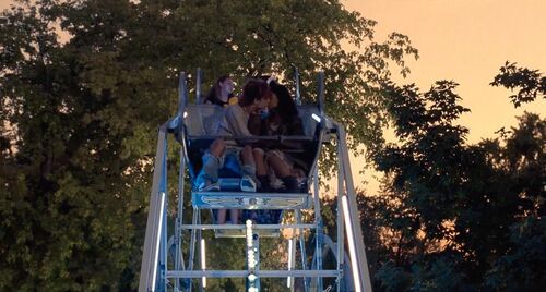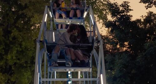 坐在圓環旋轉的“海盜船”上面,Maren和Lee忘情親吻……