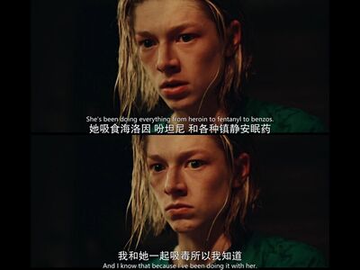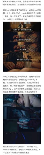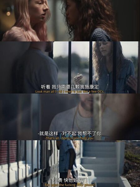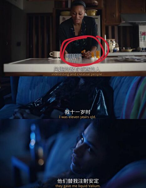 Rue第一次涉及毒品是十一岁,因为恐慌症发作被送去医院,医生给她注射了强力镇定剂——valium,一种被广泛应用但是致瘾严重的镇定药物【凯西的爸爸也是从这种药开始一点点上瘾的】,rue因为这次第一次体会到”嗨了“的感觉,开始对药物感兴趣