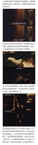 rue的毒瘾过程是穿插在剧情中的,不是线性叙述,但我下面的整理是按照时间顺序来写